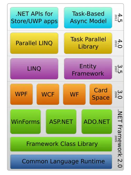Die Framework Class Library (FCL) umfasst z. B. in der Version 3.5 bereits etwa 11.400 Klassen und andere Datentypen, die in mehr als 300 sogenannte Namensräume (Namespaces) unterteilt sind.[14] Im Vergleich zur ersten Version 1.0 mit 3.581 Datentypen in 124 Namensräumen ist das ein deutlicher Anstieg. Die Klassen erfüllen Aufgaben wie das Formatieren von Text, das Verschicken von E-Mails, aber auch das Generieren von Code. Die Unterteilung in Namensräume dient dazu, die große Menge an Informationen übersichtlicher zu gestalten. Beispielsweise befinden sich Klassen zum Generieren von Code in dem Namensraum System.Reflection.Emit.