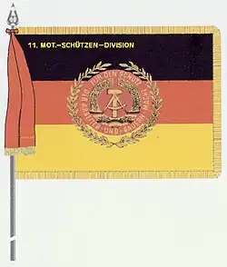 - ↑ Die Verleihung der Truppenfahne mit der Aufschrift „11. Mot.-Schützen-Division – für den Schutz der Arbeiter-und-Bauern-Macht“ wurde durch den Chef Artillerie im Ministerium für Nationale Verteidigung, Generalmajor Kunath, vorgenommen. Die Verleihungsurkunde hatte am 15. Oktober 1956 der Ministerpräsident der Deutschen Demokratischen Republik, Otto Grotewohl, unterzeichnet.