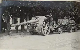 Um das schwere Geschütz durch den Motorwagen M.17 ziehen zu können, wurde die Lafette und das Fahrwerk verstärkt. Weiterhin musste es in zwei große Teile zerlegt werden. Dabei wurde das Geschützrohr vom Rückstoßsystem getrennt und auf einem eigenen Anhänger, dem Rohrwagen, verlastet. Da das Geschütz häufig sehr nah an der Front eingesetzt wurde, erhielt es einen großen gepanzerten Schild, um die Mannschaft gegen den Beschuss aus Handwaffen oder Schrapnellen etwas schützen zu können.[1]