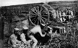 Am 28. Juli 1914 brach der Erste Weltkrieg aus, in dem Japan an der Seite der Entente-Mächte gegen die Mittelmächte Deutsches Kaiserreich, Österreich-Ungarn und dessen Verbündete beitrat. Der nahestliegende feindliche Stützpunkt war das Gebiet Kiaoutschou, der seit 1898 unter deutscher Pacht stand und sich auf der Shandong-Halbinsel an der chinesischen Ostküste befand. Die 18. Division unter Generalleutnant Kamio Mitsuomi bekam den Befehl, das deutsche Pachtgebiet mit seiner Hauptstadt Tsingtao zu belagern und einzunehmen.[2] Kamio war für seine vorsichtige Vorgehensweise bekannt und sollte, anders als 10 Jahre zuvor bei der Belagerung von Port Arthur, größere Verluste vermeiden. Dazu erhielt er Verstärkung durch die 29. Brigade, die aus dem 67. Infanterie-Regiment und einem Bataillon des 34. Infanterie-Regiments bestand.[2] Unterstützt wurden die Truppen durch über 100 Geschütze verschiedener Kaliber von 10 cm bis 28 cm sowie dem 8. Infanterie-Regiment, was die japanischen Belagerungstruppen auf fast 60.000 Mann anwachsen ließ.[2] Am 31. Oktober 1914 eröffneten die japanischen Geschütze das Feuer auf die Verteidiger von Tsingtau. Während die schweren japanischen Geschütze die feindlichen Batterien und Befestigungsanlagen zerstörten, schossen in der Nacht die japanischen 75-mm-Feldgeschütze Typ 31 Schrapnells, um Ausbesserungsarbeiten durch die Deutschen und Österreicher zu verhindern.[2] Am 6. November konnten die Japaner drei der fünf Redouten einnehmen, sodass der deutsche Kommander Tsingtaus, Kapitän zur See Meyer-Waldeck, am nächsten Tag kapitulierte. Trotz der zweimonatigen Belagerung hatten die japanischen Truppen nur 415 Tote sowie 1500 Verwundete zu beklagen.