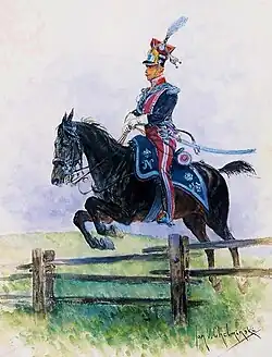 Zwischen den Franzosen und den Alliierten wurde bald darauf Frieden geschlossen. Die Polen wurden in Dresden stationiert. In der kurzen Friedenszeit konnten sie sich erholen, waren aber auch bei der Bekämpfung von Partisanen eingesetzt. Im Juni 1813 wurde eine siebte Escadron aufgestellt, was das Regiment auf eine Personalstärke von 1750 Reitern brachte.[39] Das Regiment wurde in drei Gruppen aufgeteilt: die ersten drei Escadrons gehörten zur Alten Garde, die vierte und fünfte und die sechste Escadron zur Mittleren Garde, die siebte Escadron zur Jungen Garde.