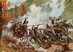 „Die erste Escadron musste eine volle Salve hinnehmen, die die Reihen in Unordnung brachte und 30 oder 40 Reiter niederstreckte. Aber die folgenden Escadrons ritten über die Verletzten hinweg, erreichten die Geschützstellungen, säbelten die Bedienung nieder und eroberten die 16 Kanonen.“