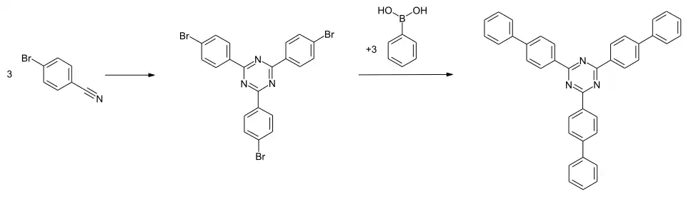 Weitere Herstellungsmöglichkeiten sind die Trimerisierung von Biphenyl-4-carbonitril in Gegenwart von Aluminiumchlorid[5] und die Umsetzung von Cyanurchlorid mit Biphenyl ebenfalls in Gegenwart von Aluminiumchlorid.[6]