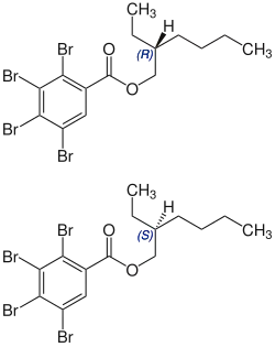 EH-TBB ist der Ester aus Tetrabrombenzoesäure und (racemischem) 2-Ethylhexanol. Entsprechend liegt die Verbindung als Racemat zweier Enantiomere vor.