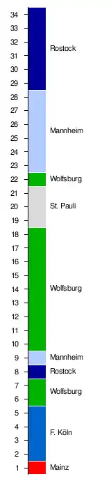 | 14. | FSV Mainz 05 | 2:2 | 1:1 | 0:2 | 2:0 | 1:1 | 1:1 | 1:1 | 4:2 | 2:5 | 2:0 | 1:1 | 3:2 | 0:3 | 1:0 | 2:2 | 4:1 | 7:1 | |