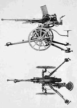 Das Rohr hatte eine Länge von 1400 mm (Kaliberlänge L/70). Der Gasabnehmer für den Lademechanismus nach dem System Hotchkiss setzte knapp vor der Hälfte des Laufes an. Der Richtmechanismus war auf der hinteren Hälfte des Gehäuses platziert. Der Lauf konnte bei Bedarf durch einen Bajonettverschluss am Gehäuse schnell ausgetauscht werden. Am hinteren Ende des Gehäuses waren zudem eine Schulterstütze und ein nach oben ragender Handgriff mit Druckknopf auf dem oberen Ende angebracht. So konnte die Waffe mit der Körperkraft des Schützen ausgerichtet und nachgeführt werden. Der Druckknopf diente als Abzug und wurde mit der linken Hand bedient. Ein u-förmiges Stahlblech diente als Wiege. Die Munitionszufuhr erfolgte durch ein nach vorn gebogenes Kastenmagazin für 20 Schuss in der Mitte des Gehäuses von oben.[3]