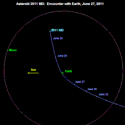 Am 27. Juni 2011 gegen 17:00 UTC kam 2011 MD der Erde bis auf etwa 12000 km nahe.
