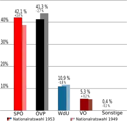 - 1953: Bei der Nationalratswahl in Österreich wird die SPÖ unter Adolf Schärf stimmenstärkste Partei. Aufgrund der Wahlarithmetik erhält die ÖVP unter Bundeskanzler Leopold Figl jedoch ein Mandat mehr.