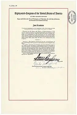 Der 23. Zusatzartikel zur Verfassung der Vereinigten Staaten von Amerika, das Twenty-third Amendment, gewährt dem District of Columbia das Recht, Wahlmänner für die Wahl des Präsidenten und des Vizepräsidenten zu stellen. Der Zusatz wurde vom Kongress am 17. Juni 1960 vorgeschlagen und wurde von der erforderlichen Zahl an US-Bundesstaaten am 29. März 1961 ratifiziert.