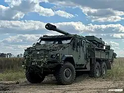 Die 2S22 Bohdana ist eine 155-mm-Radhaubitze auf LKW-Chassis, das vom Charkiwer Traktorenwerk entwickelt wurde.[1] Der erste Prototyp der 2S22 wurde während der Parade zum 27. Unabhängigkeitstag der Ukraine, die im August 2018 in Kiew stattfand, der Öffentlichkeit präsentiert. Dieses Exemplar wurde anschließend einer intensiven Evaluierung unterzogen, die bis zum Januar 2022 auf einem Testgelände der ukrainischen Streitkräfte in der Oblast Odessa durchgeführt wurde.[1] Eine Massenproduktion erfolgte damals nicht und das einzige hergestellte Exemplar, das 2018 vorgestellt wurde, kam an die Front. Unmittelbar nach dem russischen Einmarsch am 24. Februar 2022 sollte der Prototyp eigentlich zerstört werden, um zu verhindern, dass ihn die Russen erbeuten. Doch die Haubitze wurde zerlegt, ins Hinterland gebracht, wieder zusammengesetzt und der ukrainischen Armee übergeben.[2]