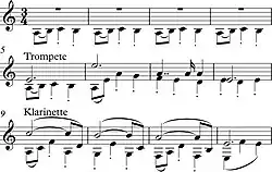 Die erste Vierergruppe ist einem „antreibenden Ostinato“ der Streicher vorbehalten, das in Folge den Beginn eines viertaktigen Themas der Trompete grundiert: Oktavsprung nach oben, Quintsprung nach unten mit doppelpunktierten Repetitionen und Rückkehr zum Ausgangston,[72] ein „signalartiger Ruf“.[96] Dazu erklingt eine aus dem Ostinato erwachsende vor allem schrittweise absteigende Gegenstimme, die eine stabile Harmonik anzeigt, im Lauf des Satzes werden damit „Tonartenfelder unfunktional gegenübergestellt“. Der nächste Viertakter bildet harmonisch einen prägnanten Stufengang aus, der im weiteren Verlauf für Modulationen verwendet wird, melodisch wird ein Motiv sequenziert, das aus einer fallenden Septim besteht und in Folge durch Vorhaltsketten kontrapunktisch angereichert wird.[97]