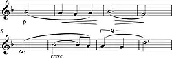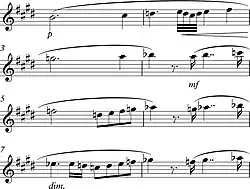 Im „Augenblick der Auflösung der Dissonanz“ setzt das dritte Thema ein, „pianissimo in plötzlicher Ruhe“, jedoch erstmals mit ausgeprägtem Rhythmus, der bis zum Schluss der Exposition durchgehalten wird,[28] es bildet somit das Ziel einer Anlage mit einer „ausgeklügelten Dosierung der zunehmenden rhythmischen Spannung, welche die drei Themen durchdringt“.[29] Es besteht aus zwei „Unisono-Klangflächen“ übereinander: eine eintaktige absteigende Figur der Holzbläser und eine ebenso lange Phrase der Streicher, beides mehrfach aneinandergereiht, was nicht im Einklang mit der klassisch-romantischen Ästhetik stand[30] und hier trotz der motivischen Lebendigkeit eine „ganz eigentümliche Starrheit“ hervorruft, die Passage wirkt „schattenhaft, dämonisch“[25] mit „huschende[n] Gestalten im unisonen Streicherapparat“.[22]