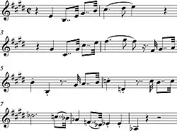 Auf einen Quartschritt abwärts folgt ein aufsteigender gebrochener E-Dur-Akkord, majestätisch in gewichtig gleichmäßigen Schritten,[13] der länger gehaltene Spitzenton suggeriert einen „weitdimensionierte[n] Raum“.[14] Auf die großen Intervalle folgen dann zwei kleine Sekundschritte, die das „mediantisch bzw. neapolitanisch leuchtende C-Dur der Takte 7/8 herbeiführen“. Quartschritte und harmonische Wechsel erwirkende unerwartete kleine Sekundschritte begegnen auch in späteren Teilen der Komposition, auch die Tonart C-Dur wird in Folge bedeutend.[15] Eine erste Zäsur tritt in der zweiten Hälfte des neunten Melodietaktes auf, mit den folgenden Taktgruppen ergibt sich das Bild einer für Bruckner untypischen asymmetrischen Gliederung. Berücksichtigt man jedoch die Harmonik und ein „Schwer-leicht-Pendel der Takte“, so passt sich die mit Auftakten aufzufassende Melodik in ein „geradzahliges metrisches Gerüst“ ein.[16] Die Ausbreitung der Melodie über zwei Register erinnert an das Konzept der „Mehrstimmigkeit in der Einstimmigkeit“ als wesentliches Prinzip der Instrumentalmusik des 19. Jahrhunderts.[17]