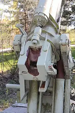 Das Geschütz war weitgehend konventionell aufgebaut. Das Rohr mit einer Länge von 55 Kalibern hatte keine Mündungsbremse. Für die Waffe wurden verschiedene Rohrtypen, darunter ein- und mehrteilige, gefertigt. Die hydraulische Rohrbremse und der pneumatisch-hydraulische Rohrvorholer waren unter- bzw. oberhalb des Rohres angeordnet. Der Rohrrücklauf war veränderlich und wurde bei zunehmender Rohrerhöhung begrenzt. Als Verschluss kam ein senkrecht laufender halbautomatischer Fallblockverschluss zum Einsatz, bei dem eine Feder das Öffnen des Verschlusses unterstützte. Der Verschluss musste manuell geschlossen werden. Ein manuelles Öffnen war nur vor der Abgabe des ersten Schusses erforderlich, danach öffnete der halbautomatische Verschluss nach der Schussabgabe, warf die Hülse der Kartusche aus, führte die Granatpatrone von der Ladeschale in die Kammer ein und verriegelte wieder. Hinter dem Verschluss befand sich die kurze Ladeschale, in die die zu verschießenden Granatpatronen eingelegt wurden. Verschossen wurde patronierte Munition. Die Konstruktion erlaubte eine praktische Feuergeschwindigkeit von bis zu 20 Schuss pro Minute. Gerichtet wurde die Waffe nach Höhe und Seite rein mechanisch, elektrische Richtantriebe waren nicht vorhanden.