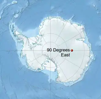 Der 90° East Lake (auch 90 Degrees East, deutsch „90 Grad Ost“) ist ein subglazialer See in der Antarktis. Mit einer Fläche von etwa 2000 km² ist er der zweitgrößte bekannte subglaziale See in der Antarktis, nach dem Wostoksee. 90 Degrees East wurde im Januar 2006 zusammen mit dem Sowjetskaja-See von Robin Bell und Michael Studinger, Geophysikalischen Forschern von der Columbia University, entdeckt. Benannt ist er nach dem 90. östlichen Meridian, auf dem er liegt. Der See liegt bei 77° 24' Süd / 90° Ost in der Nähe der aufgelassenen Antarktisstation Sowjetskaja und ist mindestens 900 Meter tief, während von einer maximalen Tiefe von 3000 Meter ausgegangen wird. Seine Wassertemperatur wird auf −2 °C geschätzt. Insgesamt wurden inzwischen (Stand 2006) mehr als 145 weitere Seen identifiziert, die unter dem Eis eingeschlossen sind.[2][1] Der Eisstausee enthält sowohl salzhaltige als auch Süßwasserschichten.[3]