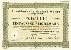 1937 übernahm der Konzern das Unternehmen und führte beide Firmennamen zu Scheidemandel-Motard-Werke AG zusammen. 1970 stellte die Unternehmensführung einen Antrag auf erneute Namensänderung. Zu häufig hatte der Namensbestandteil „Motard“ als „Motorrad“ kursiert. Mit Bewilligung des Antrags firmierte man fortan als Scheidemandel AG. 1979 erwarb die Deutsche Gelatine-Fabriken Stoess & Co. GmbH aus Baden die Aktienmehrheit und nutzte die Werke 16 Jahre lang zur Herstellung ihrer Gelatine. Die Stearinkerzenproduktion jedoch erwies sich als unrentabel und wurde 1980 eingestellt.[13][17][18]
