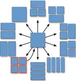Die Vorhersage kann für größere Einheiten (≤ 128×128) geschehen und diese können auf mehr Arten weiter unterteilt werden. „T-förmige“ Unterteilungsmuster für Kodiereinheiten werden eingeführt; ein Merkmal, das für VP10 entwickelt wurde. Mit einer weichen, keilförmigen Übergangslinie (keilförmig unterteilte Vorhersage) können nun für räumlich unterschiedliche Teile eines Blocks zwei getrennte Vorhersagen verwendet werden.[53] Dies ermöglicht eine genauere Trennung von Objekten ohne die traditionellen Treppenlinien entlang der Grenzen quadratischer Blöcke.
