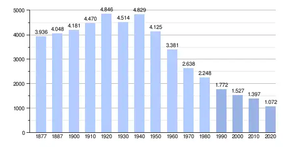 Nach einem Anwachsen der Gemeindegröße auf knapp 4200 Einwohner um 1940 sank die Zahl der Bevölkerung in der Folgezeit stetig bis ca. 1000.