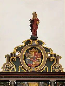 Schalldeckel mit zwei Riesen und dem auferstandenen Christus -