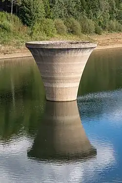 Als Hochwasserentlastung steht am wasserseitigen Dammfuß ein rund 40 m hoher, trompetenförmiger Turm, der einen runden Einlauftrichter von 11,40 m Durchmesser aufweist. Der senkrechte Fallschacht führt nach einer 90°-Krümmung als Stollen unter dem Staudamm hindurch in das Tosbecken am luftseitigen Ende. In den Stollen münden auch zwei Grundablässe mit Nennweite DN 1000. Der Hochwasserentlastungsstollen hat einen Querschnitt von ca. dreimal drei Meter.