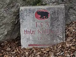 Ein ungewöhnliches historisches Denkmal aus der Anfangszeit dieses Flussbauprojekts steht am rechten Aareufer unter der Sandsteinfluh an der Raintalau bei Rubigen. Eine Kalkplatte trägt neben dem Relief eines Berner Bären die Inschrift «153 Unter Nullpunkt 1826» und eine eingehauene Höhenlinie. Der fest im Boden verankerte Stein befindet sich gemäss der modernen Geodäsie auf der Höhe von 515 m ü. M. Die negative Höhenangabe (minus 153) bezieht sich nicht auf die damals noch wenig entwickelte Landesvermessung der Schweiz, sondern auf ein regionales ad hoc-Nivellement der Aare; die Geometer bestimmten ausgehend von einem eigens für das Projekt definierten Nullpunkt in der Stadt Thun die Höhe der Ufer an der Flussstrecke bis nach Bern. Die ebenfalls noch vorhandene, ähnlich gestaltete Inschrift beim sogenannten «HauptNullpunkt» neben der Oberen Aareschleuse in Thun markiert das damals gewählte Ausgangsniveau etwas über dem heutigen Höchstwasserstand des Thunersees.[12] Die Höhendifferenz vom aktuellen normalen Seespiegel auf 558 m ü. M. bis zum Stein in der Raintalau beträgt 43 Meter. Die Angabe auf der unteren Inschrift rechnet mit dem Berner Schuh als damals üblichem Längenmass, der 0,293 Meter entspricht. Das ergibt umgerechnet die Höhendifferenz von 44,86 Meter vom Hauptnullpunkt bis in die Raintalau. Der Berner Schuh wurde 1835, also während der Bauarbeiten an der Aare, mit dem «Konkordat über eine gemeinsame schweizerische Mass- und Gewichtsordnung» durch das Metrische System abgelöst.