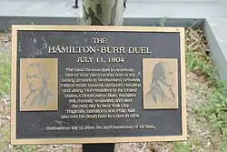 Beim Duell am Morgen des 11. Juli 1804 verwundete Burr Hamilton mit einem Schuss in den Unterleib tödlich. Der genaue Ablauf ist bis heute Gegenstand zahlreicher Spekulationen. Hamilton hatte in den Tagen vor dem Duell nicht nur sein Testament aufgesetzt, sondern in einigen persönlichen Bemerkungen auch seinen Entschluss niedergeschrieben, mindestens mit der ersten seiner Duellkugeln nicht auf den Gegner zu zielen, sondern den ersten Schuss zu vergeuden – um Burr zu beschwichtigen, aber auch, da ein Duell seinen religiösen Überzeugungen grundsätzlich zuwider sei. Hamilton hätte dadurch willentlich seinen eigenen Tod in Kauf genommen oder herbeigeführt.[48] Burr, der von Hamiltons Entschluss nichts wissen konnte, und auch sein Sekundant William P. Van Ness gaben später an, dass die Duellanten etwa gleichzeitig geschossen hätten und dass Hamilton durchaus auf Burr gezielt habe, wenn auch die Kugel ihr Ziel weit verfehlte. Hamiltons Sekundant Nathaniel Pendleton gab jedoch an, dass Hamiltons Schuss versehentlich zu früh losgegangen sei.[49] Eine Untersuchung der Duellpistolen durch Experten der Smithsonian im Jahr 1976 legt den Schluss nahe, dass der Abzug der Waffen – die Hamilton als Herausgeforderter wählen durfte – präpariert war. Während Burrs Pistole einen konventionellen Abzug besaß, bei der ein Abzugsgewicht von mehr als 5 Kilogramm aufgebracht werden musste, war Hamiltons Waffe auf einen weitaus niedrigeren Widerstand eingestellt, was Hamilton einen unlauteren Vorteil verschafft hätte; diese Manipulation könnte auch erklären, warum sein Schuss, wie Pendleton angab, tatsächlich zu früh gefeuert wurde.[50]