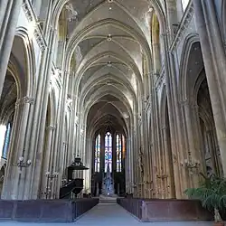 Das Erscheinungsbild des Gebäudes ist relativ klassisch. Im Westen stand auf der Vorderseite ein hoher Glockenturm, während im Osten zwei kleinere den Chor mit Blick auf die Mosel flankieren, die etwas unterhalb fließt. Die oberen Teile dieser drei Türme wurden 1395 durch einen Brand zerstört. Die Anwesenheit von Türmen, die den Chor umrahmen, ist eine direkte Anpassung des Plans der Kathedrale von Toul.