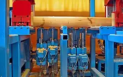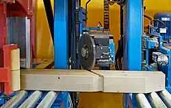 Das Werkstück wird dann in der Regel dem jeweiligen Aggregat (sägen, fräsen, markieren, …) zugeführt und bearbeitet. Der Transport der Bauteile bzw. Werkstücke erfolgt über verschiedene Transportsysteme wie z. B. Greif- und Führungswagen. Mit diesen kann auch bei verdrehten oder krummen Hölzern die notwendige Genauigkeit der Bearbeitung erzielt werden.
