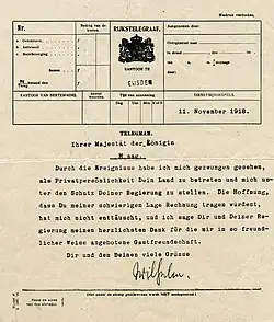 Offiziell hatte Wilhelm noch nicht abgedankt – die Pressemitteilung des Kanzlers war ohne rechtlich bindende Wirkung. Daher war er noch ein Offizier der Streitkräfte einer kriegführenden Macht, und als solcher hätten ihn die Niederlande als neutrale Macht eigentlich internieren müssen. Das war bisher mit allen deutschen, britischen und belgischen Soldaten geschehen, die die Grenze überschritten hatten. Der britische Botschafter Walter Beaupré Townley verlangte daher bereits am 10. November von den Niederländern, Wilhelm zu internieren. Ähnliches verlautbarte die französische Regierung. Doch die niederländische Regierung beschloss, Wilhelm nur als Privatperson zu behandeln und ihn vorläufig in Amerongen wohnen zu lassen. An dieser Haltung hielt sie auch bei der Parlamentsdebatte bei, als Sozialdemokraten und Kommunisten seine Ausweisung bzw. Internierung forderten.[109] Am 11. November schickte Wilhelm ein Telegramm an Königin Wilhelmina, in dem er sich für die angebotene Gastfreundschaft bedankte und sich unter ihren Schutz stellte.[110]