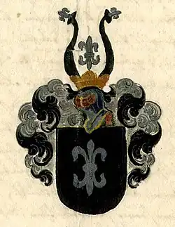 - Blasonierung des Stammwappens von 1647: In Schwarz eine silberne Lilie. Auf dem gekrönten Helm mit schwarz-silbernen Helmdecken schwarze Büffelhörner an der Spitze mit einer silbernen Lilie besteckt, dazwischen eine silberne Lilie.