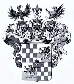 - Blasonierung des Wappens von 1708: „Schild quadriert mit Mittelschild, dieser von Silber und Schwarz geteilt: Lilie farbengewechselt. 1 und 4 von Schwarz und Silber viermalvier geschacht. 2 und 3 von Silber und Rot geteilt: gekrönter Greif gewechselt. Auf dem Schild die Freiherrnkrone darüber drei gekrönte Helme, auf dem ersten die Decke von Österreich und gekrönter schwarzer Adler belegt mit silbernem Balken, auf dem mittleren schwarzweiße Decke und silberne Lilie, auf dem dritten ebensolche Decke und halber gekrönter Greif rot belegt mit silbernem Balken.“[8]