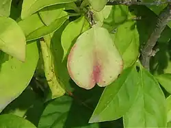 Die Blütezeit liegt im Frühjahr, bevor die ersten neuen Blätter erscheinen. Die seitenständigen, traubigen Blütenstände besitzen eine dunkelviolette Blütenstandsachse (Rhachis). Die duftenden Blüten sind vierzählig. Die vier weißen oder blass pinkfarbenen Kronblätter sind etwa 1 cm lang. Die bei einem Durchmesser von 2 bis 3 cm runde Flügelnuss enthält jeweils einen Samen je Samentasche.[4]