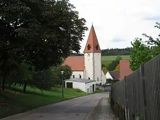 Die Kirche, eine Filiale von Zell, ist eine gotische Chorturmanlage, die 1743/44 barockisiert und 1922/23 nach Westen erweitert wurde. Der Hochaltar stammt vom Ende, die Seitenaltäre von der Mitte des 17. Jahrhunderts. Älter ist die Kanzel (um 1650).[28] Das Schiff misst 14 mal 5,7 Meter. 1890 kamen neue Glocken in den Spitzturm, die 1922 ersetzt wurden. 1911 erhielt die Kirche eine neue 5-Register-Orgel des Eichstätter Orgelbauers Bittner.[29] Die Friedhofsummauerung besteht aus Sandsteinquadern.