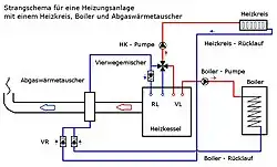 In Heizungsanlagen wird das Abgas vor dem Eintritt in den Schornstein zunächst über ein Register geleitet, um einen Teil der Wärmeenergie wieder dem Heizkreislauf zuzuführen.