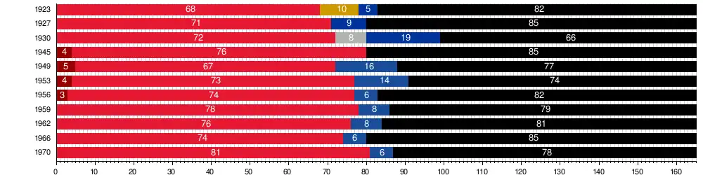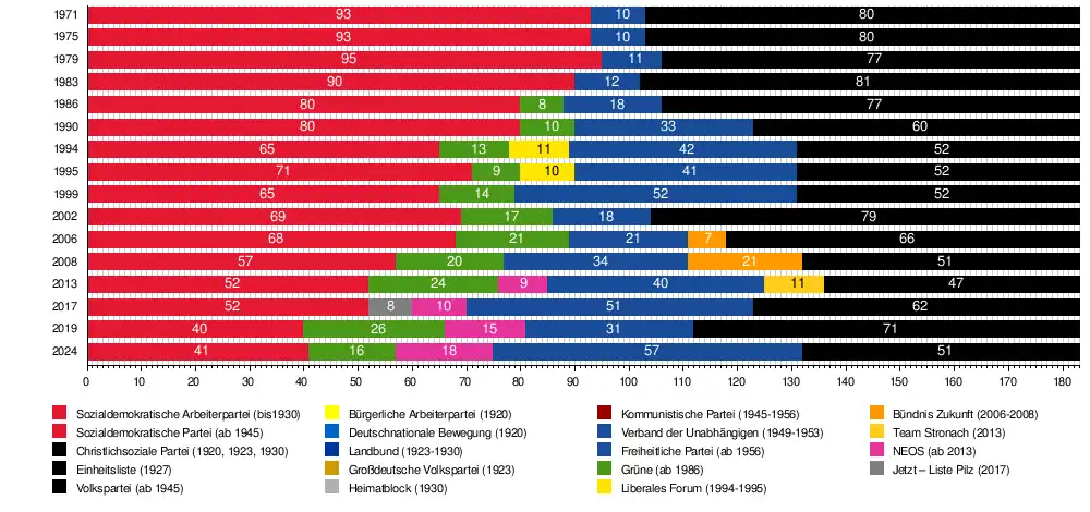 Ab 1945 hatte der Nationalrat zunächst 165 Abgeordnete, erst 1971 wurde die Anzahl der Abgeordneten wieder auf 183 erhöht. Dies war die Gegenleistung der SPÖ an die FPÖ für die Stützung der SPÖ-Minderheitsregierung. Vorrangiger Wunsch der Freiheitlichen war, mit ihren damals 5,5 Prozent wieder Klubstärke, die damals bei acht Abgeordneten lag, zu erreichen.[2]