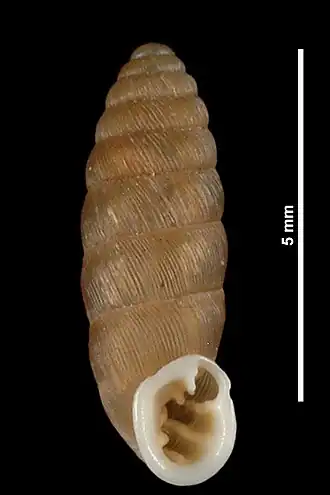 Das schlank bis sehr schlank-spindelförmige bis zylindrisch-spindelförmige Gehäuse ist 5,5 bis 8,7 mm hoch und 2,0 bis 2,4 mm breit. Es hat 8 bis 10 schwach bis sehr schwach gewölbte Windungen. Die größte Breite wird etwa in der Mitte des Gehäuses erreicht. Die Oberfläche ist regelmäßig fein gestreift. Am Mündungsrand ist eine mäßig stark bis stark verdickte weiße Lippe ausgebildet, die aber nicht schwellenförmig ist. Die Mündungsränder sind im Parietalbereich miteinander verbunden und können bis 0,8 mm vorgezogen sein. In der Mündungsbewehrung ist die Parietalis kräftig entwickelt, auch eine Angularis ist immer vorhanden. Dagegen ist eine Spiralis nur selten vorhanden, sie ist dann nicht mit der Angularis verbunden. Meist fehlt auch eine Subangularis; gelegentlich ist an dieser Stelle ein kleiner Höcker vorhanden, der mit der Angularis verbunden ist. Die Columellaris ist stärker ausgebildet als die Infracolumellaris. Letztere reicht aber weiter nach vorne zum Mündungsrand. Die Palatalis superior, die Palatalis inferior und die Infrapalatalis sind als Doppelhöcker ausgebildet und reichen bis zur Mündungslippe nach vorne. Gelegentlich ist auch noch eine schwache Suprapalatalis vorhanden. Die letzte Windung ist etwas eingeengt und mehr oder weniger stark schief abgeflacht. Die Basis ist stark gekielt. Im Bereich der Infrapalatalis ist das Gehäuse schwach eingedrückt. Der Mündungsrand verläuft im Gaumenbereich (palatal) annähernd vertikal. Der Nabel ist eng und senkrecht von unten gesehen kaum zu erkennen.