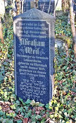 1869 wurde Abraham Weil auf eigenen Wunsch von Trippstadt ins vorderpfälzische Leimersheim versetzt.[2] Hier gründete er 1875 die Gemeindesparkasse, was sich vorteilhaft auf die Entwicklung des Dorfes auswirkte. Deshalb ernannte man Weil 1884 zum Ehrenbürger von Leimersheim und benannte 1963 auch eine Straße nach ihm.