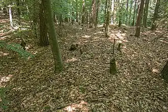 ![]() Abschnittsbefestigung Kalmusfels – Blick auf den verflachten Wall-Graben (Juli 2013) | ||