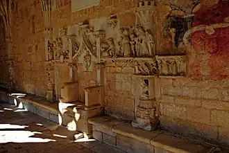 Der Rhythmus dieser schönen romanischen Einheit wird durch drei Pfeiler aus dem Ende des 15. Jahrhunderts unterbrochen. Es sind folgende Themen dargestellt: Gleichnis von Lazarus beim bösen Reichen, Laienbruder von Virgil, Tod des Lazarus. Auf der gegenüberliegenden Seite der Galerie haben zwei Pfeiler folgende Themen: Hiob auf dem Misthaufen, Tod des schlechten Reichen. Das Gewölbe des Kapitelsaals, die beiden in die Ostwand gebrochenen großen Öffnungen und der Kieselsteinboden stammen aus dem 17. Jahrhundert.