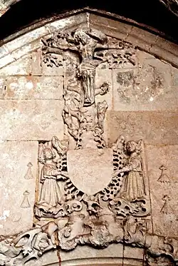 Die Christuspforte ist gestaltet im Stil der Renaissance. Das Bogenfeld zeigt Christus, der auf einem Eichenzweig gekreuzigt ist. Drei Königswappen auf Hermelingrund erinnern an königliche Wohltaten. Über den Wappen links ist ein Pelikan mit der Fütterung der Jungen beschäftigt, womit die Opferung versinnbildlicht ist, und rechts ein Phönix, der aus der Asche neu ersteht, bedeutet die Auferstehung.