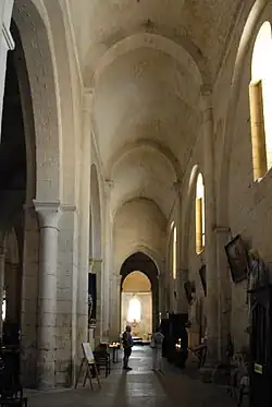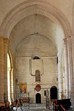 Das Mittelschiff wird von einem angespitzten Tonnengewölbe überdeckt, das zwischen den Jochen von ebenso angespitzten Gurtbögen unterstützt wird. Diese stehen auf halbrunden Säulen, die auch Dienste genannt werden, die von schlichten Kapitellen und profilierten Kämpfern bekrönt sind. Die Kämpfer befinden sich in Höhe der Bogenansätze, die zwischen den Kapitellen mit einer Art Zahnprofil markiert werden.