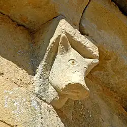 Zwischen der romanischen Pforte und den Öffnungen des Kapitelsaals stellt ein Konsolrelief den Zorn dar und weiter unten auf dem Pfeiler einen gefräßigen Mönch.