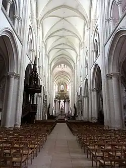 Der in den Jahren zwischen 1170 und 1220 errichtete heutige Kirchenbau gehört zu den entwicklungsgeschichtlich bedeutendsten und interessantesten Beispielen der Übergangszeit von der Romanik zur frühen Gotik in der Normandie. Von dem im Jahr 1099 geweihten Vorgängerbau blieb wenig, denn er brannte im Jahr 1168 ab; übrig geblieben sind nur zwei Kapellen auf der Nordseite des bereits im Jahr 1106 geweihten Chorumgangs, dem ältesten der Normandie. Unmittelbar danach begann ein Neubau in den Stilformen der beginnenden Gotik. Der von Pilgerströmen zusammengetragene Reichtum der Abtei erlaubte einen für mittelalterliche Verhältnisse raschen Baufortschritt. Vor 1219 wurde mit den fünf westlichen Jochen des Langhauses der Bau im Wesentlichen abgeschlossen, sie zeigen mit schlanken Formen in den Pfeilerquerschnitten und den Arkaden der Emporen eine weiter entwickelte Stilstufe als die fünf östlichen Joche. Die ungewöhnliche Länge des Kirchenschiffs (es ist zwei Meter länger als das von Notre-Dame in Paris) und Architekturelemente wie der Chorumgang sind ebenfalls mit der Rolle des Gebäudes als Pilgerkirche zu erklären. Chor und Querhaus gehören noch dem 12. Jahrhundert an.[1] Typisch für normannische Baugewohnheiten ist der durchlichtete, ca. 65 Meter hohe Laternenturm über der Vierung.
