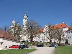 Baumeister des von 1699 bis 1712 errichteten Konventgebäudes war Michael Wiedemann aus Unterelchingen. Noch kurz zuvor (1697) hatte er mit dem Bau des Schlosses Freudental begonnen.[24] Der Barockgiebel der Westfassade wurde vermutlich 1755, spätestens aber bis 1792 wegen Baufälligkeit entfernt. Der heutige Giebel ist eine Nachbildung aus dem Jahr 2004, die aus Brandschutzgründen nötig wurde. Der originale Giebel war vermutlich nie zur selben Zeit wie die barocke Kirche vorhanden, ein Umstand, der eine Diskussion um die Beeinträchtigung eines Kulturdenkmals anstieß.[18]