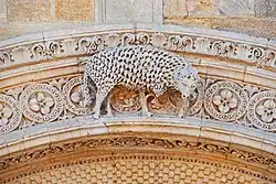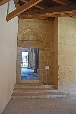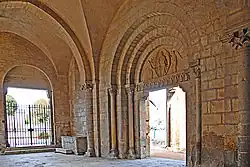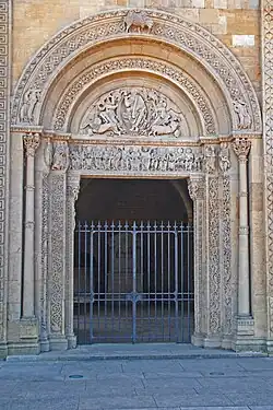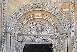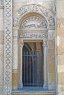 Die Portalöffnung über einer Brüstung wird flankiert von schmalen Wandstreifen, denen etwas zurückgesetzt halbrunde Säulen vorgeblendet sind. Diese sind mit pflanzlich und figürlich skulptierten Kapitellen und Kämpferplatten und profilierten Basen auf Plinthen ausgestattet. Auf ihnen liegt ein schlanker Architrav auf, der bis gegen die seitlichen Wandenden stößt. Über dem Relief des Architravs ist ein weit ausladendes Kragprofil mit abgeschrägte Vorderseite angebracht, das mit Blattfächern dekoriert ist. Es wird um die Wandstreifen herumgeführt. Auf den Wandenden steht ein scharfkantiger Archivoltenbogen, dessen Vorderseite mit fünf relativ großen Figuren skulptiert ist. Sie werden dem Thema der Verklärung des Herrn zugeordnet. Die Innenseite des Bogens ist mit geschwungenen Ranken dekoriert.