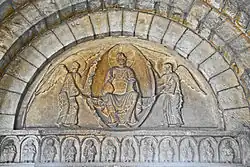 Im Architrav erscheinen dann Maria mit zwei Engeln inmitten der zwölf Apostel. Diese Reihe von 15 Personen sitzt auf einer durchgehenden Bank und setzt sich auch im gestuften Gewände des Portals fort, wo Bischof Ratbert, Johannes der Täufer sowie die beiden Könige David und Boson stehend dargestellt sind. Alle scheinen das Nahen der Parusie zu erwarten. Drei Personen wurden die abgeschlagenen Köpfe nachträglich ersetzt. Bei den anderen sind nur die Nimben übrig geblieben. Die sitzenden Apostel haben alle ein Buch oder andere Gegenstände in den Händen, der Apostel rechts außen hat ein Buch auf den Knien aufgeschlagen. Die vierte Person links von Maria ist Petrus, an den hängenden Schlüsseln zu erkennen.