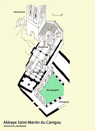 Von den vorgenannten Beobachtungen ausgehend wird für die Kirche Saint-Martin du Canigou folgende Chronologie vorgeschlagen.[6] Der Ostteil beider Geschosse bestand schon bei der ersten Weihe im Jahr 1009. Danach ruhte die Bautätigkeit, belegt wird dies anhand der provisorischen Fassade, deren Existenz man in der Krypta feststellen kann. Die Unterbrechung war allerdings von kurzer Dauer und vor dem Jahr 1014, spätestens jedoch 1026, wurde die westliche Hälfte hinzugefügt. Aus ästhetischen Gründen und weil keine zwingende Notwendigkeit bestand, verzichtete man in der Oberkirche auf die technischen Neuerungen, die man in der Krypta ausprobiert hatte: Die Tonnengewölbe wurden über Säulen nach Osten und Westen einfach weitergespannt. Nach dem Bau der Kirche fügte man an deren Südflanke im Osten eine schmale Kapelle hinzu, in der die Reliquien des heiligen Gaudérique verehrt wurden. Ihr Chor bildet eine vierte Apsis, die mit den übrigen Apsiden fluchten. Ihr Mauerwerk ist schmucklos.