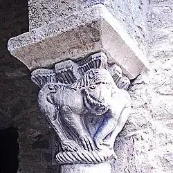 An anderen Orten nehmen geflügelte Widder dieselbe Stellung ein, ebenso wie einige heute völlig verstümmelte Tiere, bei denen es sich vielleicht um Ratten handelt. In diesem letzten Fall wird das Augenmerk des Betrachters besonders auf die großen, ausdrucksstarken menschlichen Köpfe gelenkt, die sich unterhalb der Deckplatte auf jeder der vier Seiten in der Mitte des Kapitells befindet. Neuartig sind die grotesken oder satirischen Motive, die auf eine veränderte Geisteshaltung schließen lassen. Ein zwitterhaftes Wesen, zugleich Abt mit Mitra und Tier, wirft mit lüsternen Blicken um sich und zieht eine scheußlich grinsenden Grimasse. Umgeben ist es von dämonischen Gestalten mit Hörnern, zu denen auch ein Hund mit riesiger, aus dem Maul hängenden Zunge gehört. Im Laster offenbart sich das animalische Leben des Menschen.