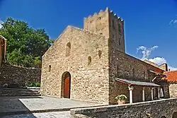 Auf der linken Seite taucht das Gebäude einer kleinen romanischen Kirche auf, das in den Jahren 1978/79 Dom Chabannes aus den eingestürzten Mauern wieder errichten ließ. Die alte romanische Kirche war unter dem Namen Saint-Martin le vieux bekannt. Sie besaß ein Längsschiff mit im Grundriss halbkreisförmiger Chorapsis und zwei seitlichen Anbauten, die eine Art unechtes Querschiff bilden. Ähnlich der Abteikirche weist diese einen an das Langhaus seitlich angelehnten quadratischen Glockenturm auf, mit je zwei rundbogigen Schallluken auf zwei gegenüberliegenden Seiten und einen Zinnenkranz aus je einer ganzen und zwei halben spitzen Zinnen auf jeder Turmseite. Vielleicht war diese Kirche ursprünglich als Begräbnisstätte für die Mönche gedacht, da auf dem Felsplateau, auf dem sich die Abtei erhob, kaum Platz war, dort ihre Toten zu begraben.