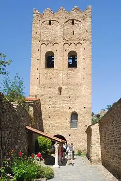Der untere Teil des Turms, ohne jede Dekoration, bleibt deutlich unter der Hälfte der heutigen Höhe, bestand zweifellos schon 1009, denn in der Weiheurkunde aus diesem Jahr wird eine Widmung an den Erzengel erwähnt. Wie es auch bei der Kirche der Fall war, wurde dann der Weiterbau eine Zeit lang unterbrochen. Als er wieder aufgenommen wurde, hat man die weiteren Wandoberflächen geringfügig zurückversetzt und diese mit verschiedenen Maßnahmen im lombardischen Stil zu dekorieren, wie es im Verbreitungsgebiet des premier art roman méridional allgemein üblich war. Ein Stück über dem vorgenannte Rücksprung finden sich auf jeder Seite zwei lang gestreckte Wandnischen in geringer Tiefe, die oberseitig von einem dreifachen Rundbogenfries und seitlich von Lisenen begrenzt werden, an den Bauwerkskanten von breiteren, in der Mitte von einer schmalen. im oberen Bereich dieser Nischen ist je eine große rundbogige Schallluke ausgespart. Auf der Nord- und Südseite des Turms sind zwischen den Rundbogenfriesen und den Zinnen noch einmal Schallluken ausgespart, in gleicher Form und Größe und genau über den Luken darunter. Ihre Öffnungskanten weisen kantige Rückversätze auf. Auf der Ostseite sind an dieser Stelle zwei offene Zwillingsarkaden ausgespart in Breite der Wandnischen darunter und so hoch, wie die anderen Schallluken. Sie werden getrennt von Säulchen mit schlichten Kapitellen. Die Öffnungskanten weisen kantige Rückversätze auf. Auf der gegenüber stehenden Westseite sind statt der Schallöffnungen zwei flache Wandnischen eingelassen, etwa so groß, wie die Zwillingsarkaden. Sie werden oberseitig von je einem Korbbogen abgeschlossen. In den Nischenhintergründen ist je eine kleine rechteckige Öffnung ausgespart, unter einer noch zusätzlich eine schmale Schießscharte. Auf derselben Seite ist noch knapp über dem die Bauabschnitte trennenden Rückversatz je ein kleines schlankes rundbogiges Fenster in Turmmitte ausgespart, mit stark aufgeweiteten Gewänden. 1026 soll der Turm gänzlich fertiggestellt sein.